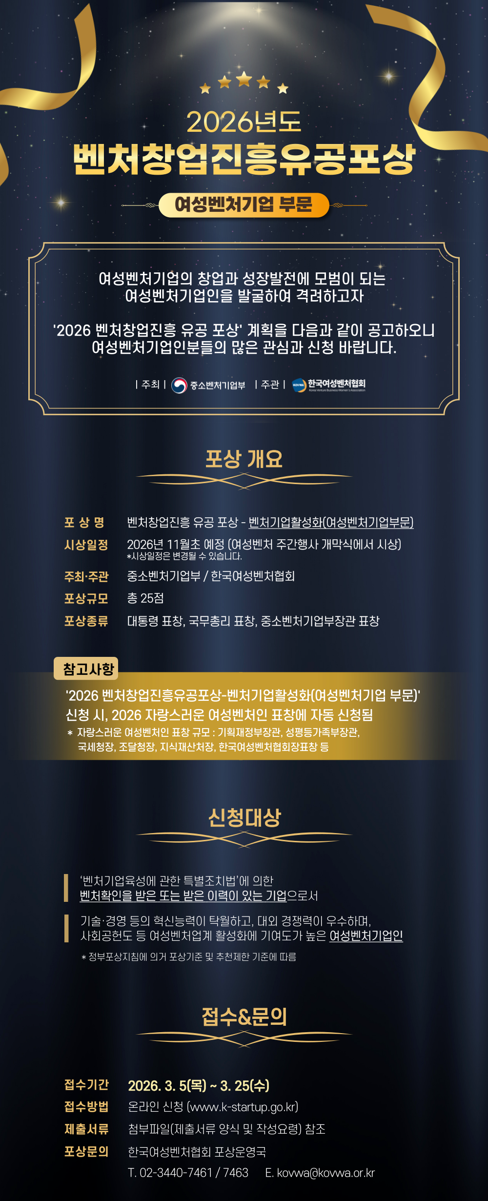 Local Navigation bar 협회소개 인사말 연혁 조직도 오시는길 회원사 가입안내 임원사 소개 주요사업 이브와 ICT멘토링 채용연계형 SW전문인재양성 차세대 ICT 여성리더 육성 정보마당 공지사항 보도자료 유관기관소식 ICT/SW행사안내 자료실 지회 영남지회 호남지회 Global Navigation bar SITEMAP 정보마당 홈 정보마당 협회소개 회원사 주요사업 정보마당 지회 공지사항 공지사항 보도자료 유관기관소식 ICT/SW행사안내 자료실 공지사항 Home > 정보마당 > 공지사항 뉴스레터 갤러리 행사안내 IT관련뉴스 보도자료 회원사소식 교육정보 유관기관소식 ICT/SW 행사안내 차세대 ICT 여성리더 육성 자료실 갤러리게시판 공지사항 1:1문의 리뷰 [한국여성벤처협회] 2026년도 벤처창업진흥유공포상 신청 안내 관리자2026-03-11 첨부파일2026_벤처창업진흥유공_포상_공고.pdf 관리자 / 2026-03-11 목록