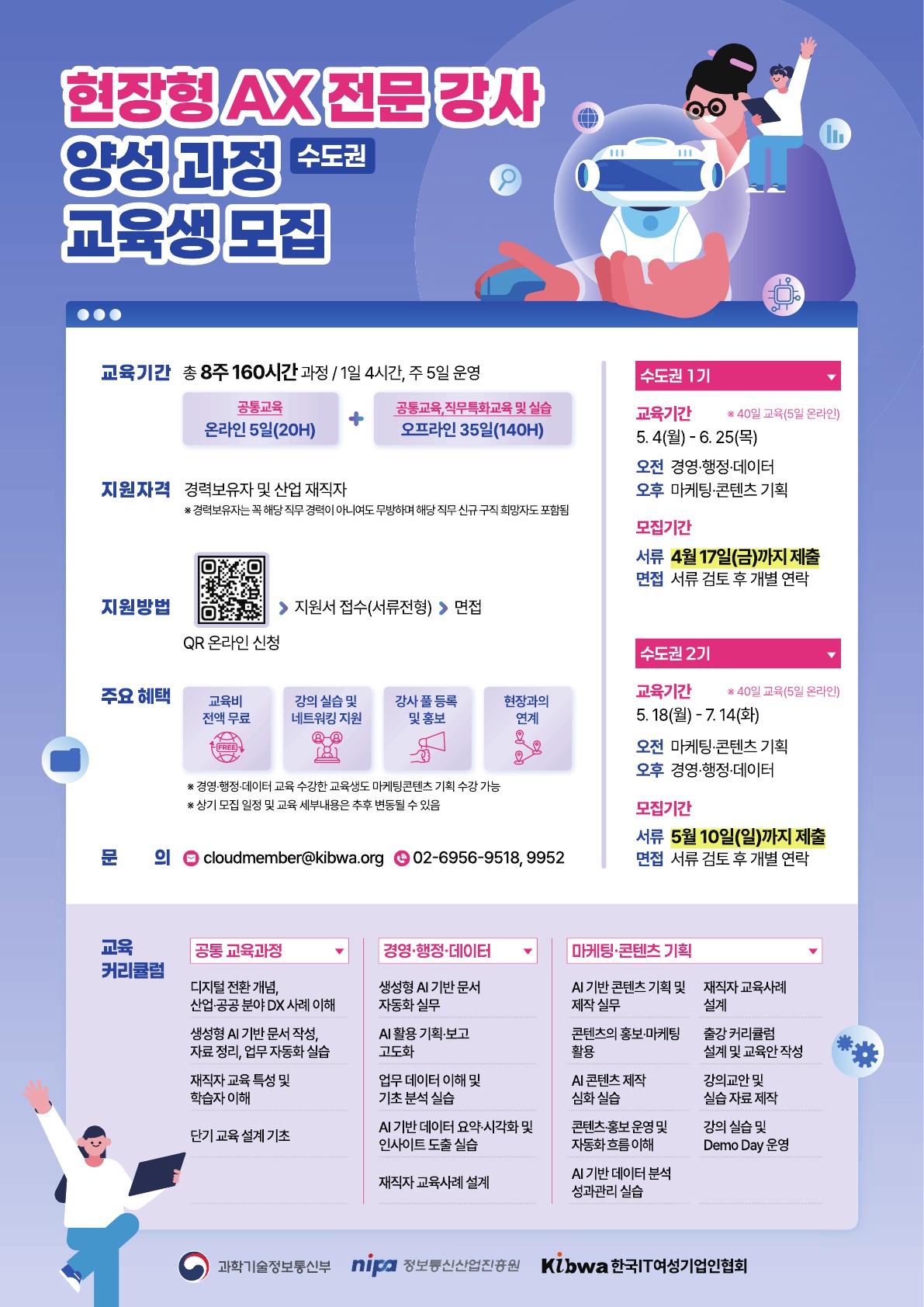 [IT여성기업인협회]2026 현장형 AX 전문 강사 양성 과정(수도권) 교육생 모집 안내 (2기 ~5.10. 서류제출 마감) 관리자2026-03-12