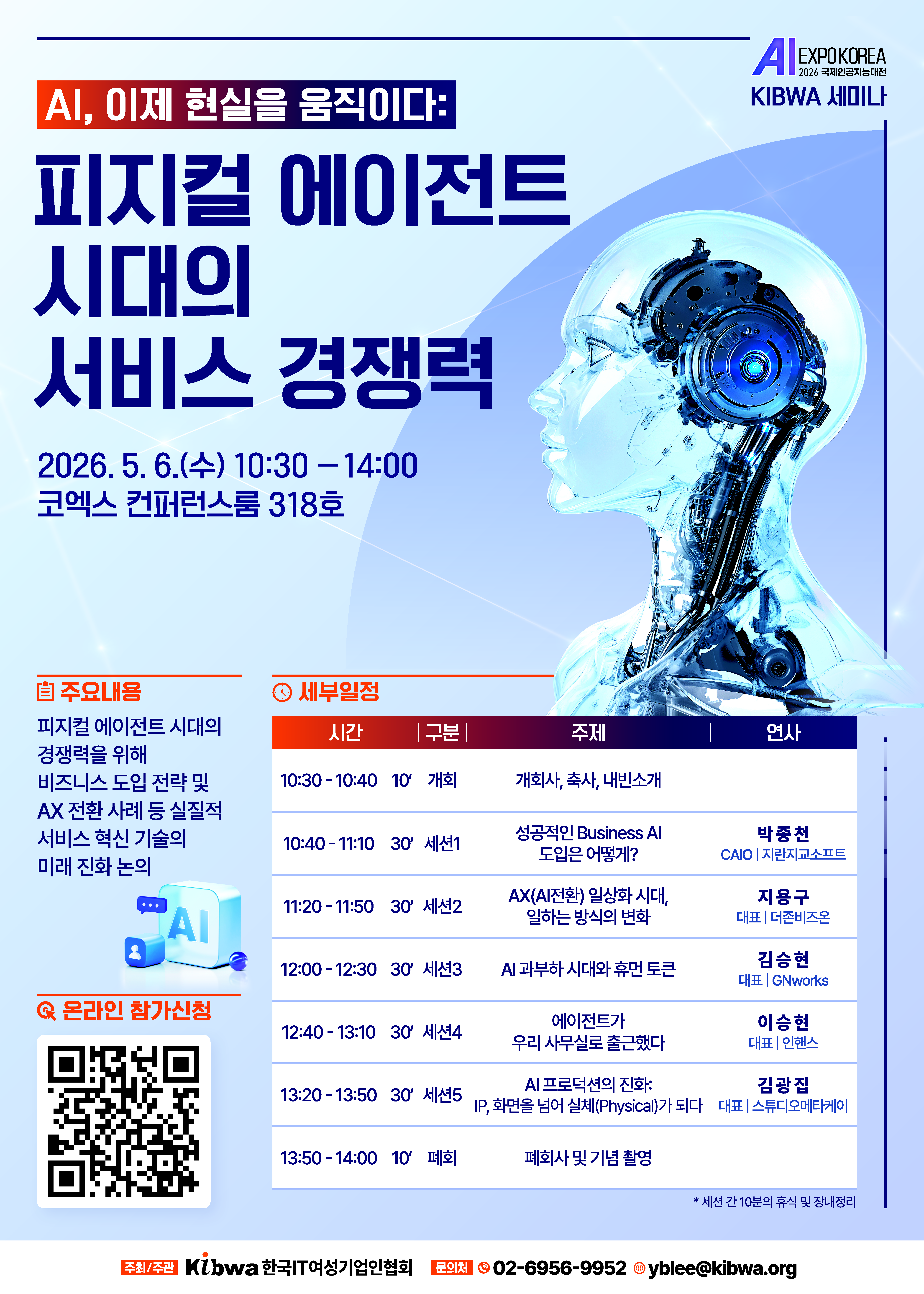 비즈니스 도입 전략부터 AX(AI 전환) 실무 사례까지, AI 산업의 최전선을 한눈에 파악할 수 있는 KIBWA 세미나에 여러분을 초대합니다.