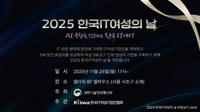 - [NIPA] 차세대 ICT여성리더 육성사업 「2025년도 ICT·SW 여성 창업 공모전」최종 수상팀 발표 안녕하세요.한국IT여성기업인협회 사무국입니다. 2025년도 ICT·SW 여성 창업공모전의 모든 심사 절차가 마무리되어아래와 같이 최종 수상팀을 발표합니다. 또한, 관련 안내사항도 함께 공지하오니 꼭 확인해주시기 바랍니다. [최종 수상팀 발표] 구분 접수번호 아이디어 팀명 상금 대상 과학기술정보통신부 장관상 WICT-10 스*트 속*한 *어 강*영 200만원 (창업 멘토링 지원) 최우수상 정보통신산업진흥원장상 WICT-68 페**데이(P****day) 페**데이(P****day) 100만원 * 2팀 WICT-29 **** 기능이 있는 **, ** 장애인 “AI ** ***” G**DE 우수상 IT여성기업인협회장상 WICT-27 Ca**li*Q Ca**li*Q 50만원 * 3팀 WICT-30 M***ng 토*(Te** Our ***th) WICT-28 X***r X**id 장려상 IT여성기업인협회장상 WICT-26 **** 관리 및 ** 업무 효율화를 위한 **** 전용 업무 관리 ** *** 서비스, 피*링 피*링 - WICT-56 M**ky M**ky WICT-55 Z**-UP(*업) 기*(여* 길) WICT-22 뉴***드 N* [안내사항] 1. 수상팀 상장 발급 및 상금 지급 안내 - 상장 및 상금 지급에 필요한 제출 서류 관련 안내는 10월 중 개별 이메일로 발송될 예정입니다. - 서류 제출 시 기재한 이메일 주소로 안내 메일을 발송해드릴 예정이오니 참고하여 기한 내에 제출해 주시기 바랍니다. 2. 시상식 일정 안내 대 상일 시장 소비 고2025년도 ICT·SW 여성 창업 공모전대상~장려상(총 10개팀)11/24(월)17:00~엘타워· 행사명: 2025 한국IT여성의 날· 내 용: 공모전 수상자 상장 수여 * 11월 예정된 시상식의 세부 일정은 변동될 수 있습니다. * 시상식 참석과 관련하여, 해당 팀에는 별도 안내 후 참석 여부를 확인할 예정입니다. * 시상식 참석자에게는 ‘시상식 참가 확인서’를 발급해드릴 예정입니다. 참여해 주신 모든 분들께 깊은 감사의 말씀을 전하며, 이번 공모전이 뜻깊은 경험이 되셨기를 바랍니다. 감사합니다. ○ 문의: ICT·SW 여성 창업공모전 사무국(wictstartup@kibwa.org, 02-6956-9506, 9504)