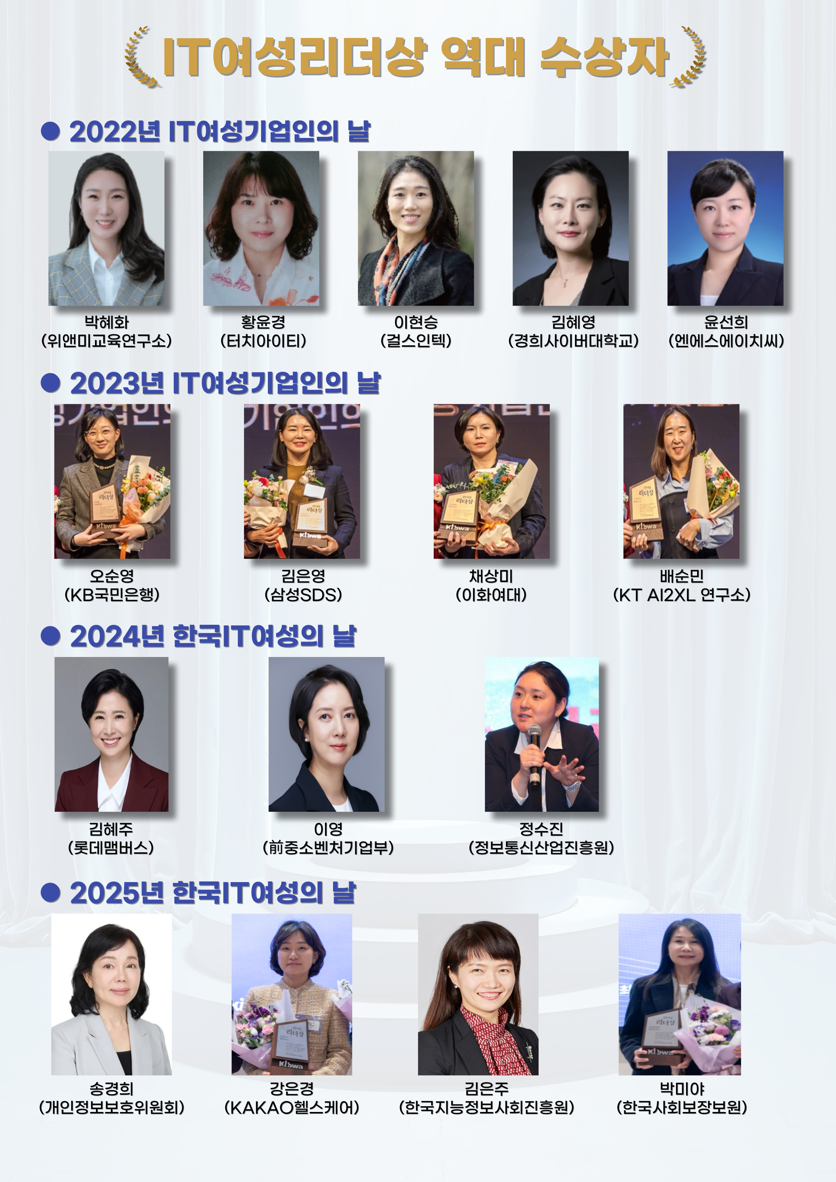 Local Navigation bar 협회소개 인사말 연혁 조직도 오시는길 회원사 가입안내 임원사 소개 주요사업 이브와 ICT멘토링 채용연계형 SW전문인재양성 차세대 ICT 여성리더 육성 정보마당 공지사항 보도자료 유관기관소식 ICT/SW행사안내 자료실 지회 영남지회 호남지회 Global Navigation bar SITEMAP 정보마당 홈 정보마당 협회소개 회원사 주요사업 정보마당 지회 공지사항 공지사항 보도자료 유관기관소식 ICT/SW행사안내 자료실 공지사항 Home > 정보마당 > 공지사항 뉴스레터 갤러리 행사안내 IT관련뉴스 보도자료 회원사소식 교육정보 유관기관소식 ICT/SW 행사안내 차세대 ICT 여성리더 육성 자료실 갤러리게시판 공지사항 1:1문의 리뷰 [한국IT여성기업인협회] IT여성리더상 역대 수상자 안내 관리자2025-03-19 관리자 / 2025-03-19 목록